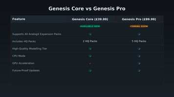 Genesis Pro (£89.99, Coming Soon) is built for professionals who demand maximum power. With GPU acceleration, 5 free packs, and future-proof updates, Pro delivers ultra-smooth performance even in large sessions — the ultimate AnalogX experience.